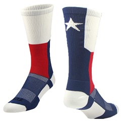 TCK Texas Flag Crew Socks. High performance athletic socks for all team sports and elite athletes. Small fits a Youth Shoe Size 2-6. Medium fits a Men’s Shoe 6-9 and Women’s Shoe Size 7-10. Large fits a Men’s 9-12 and Women’s 10-13. X-Large fits a Men’s 12-15 and Women’s 13-16. Fiber Contents: 75% Polypropylene, 13% Nylon, 9% Elastic, 3% Lycra Spandex.